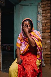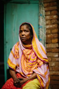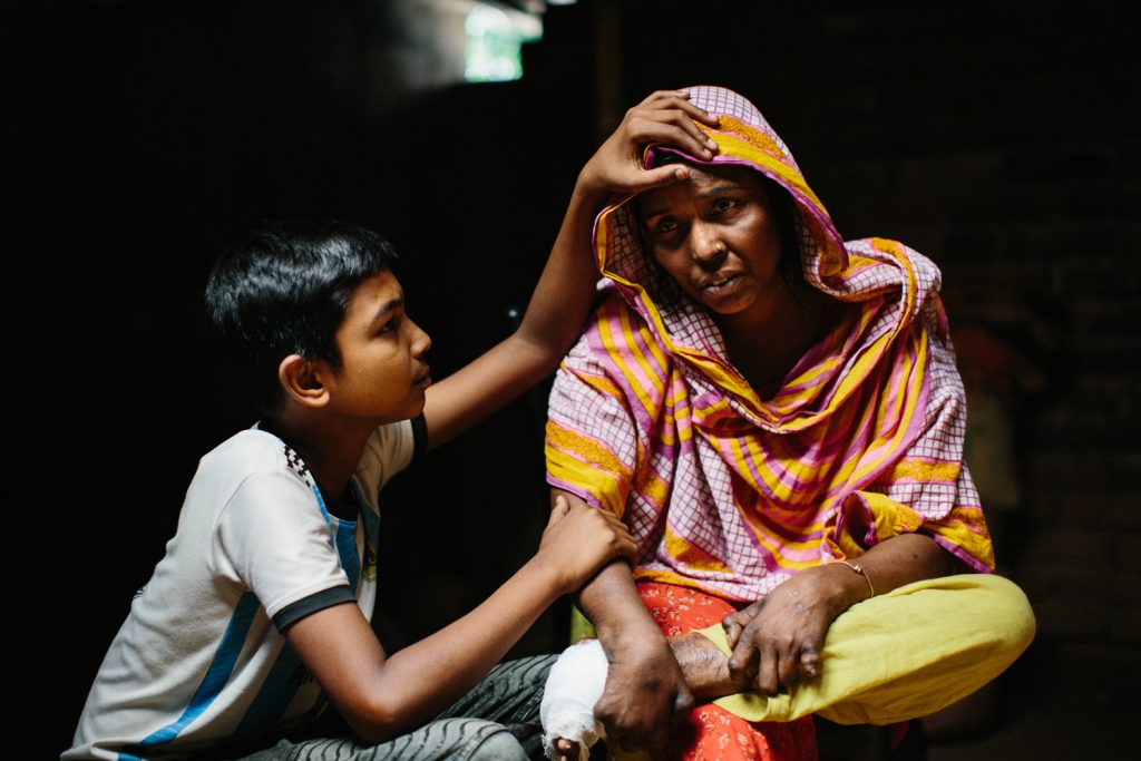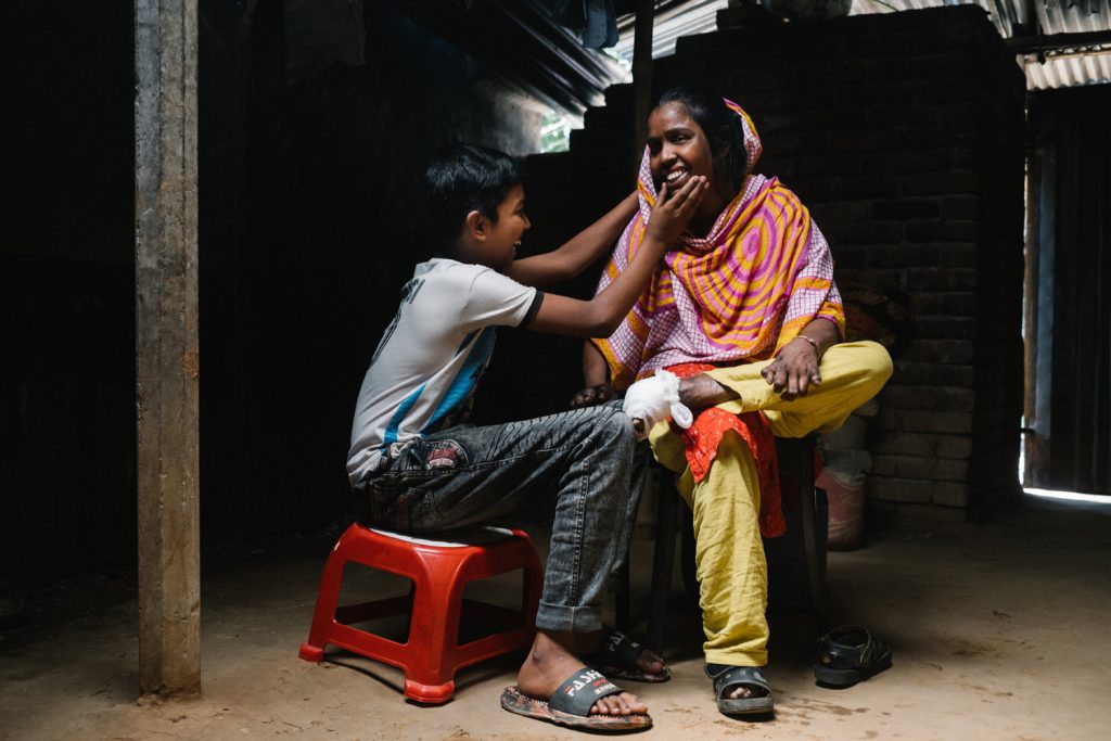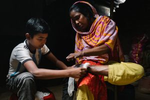 Tohmina is 45. She developed leprosy aged 6 with patches on her face and back. She developed blisters and then ulcers on her feet. Her father tried many medicines with no improvement. A man visiting her home suspected leprosy. Her father took her an NGO health centre where leprosy was diagnosed. Her father then had a mental breakdown over her diagnosis. Her elder brother rejected her from their home saying that she could not stay in the house if she had leprosy. Her father took her to Nilphamari hospital. She took medicine from there and was cured but her ulcers recurred. She married a fellow patient in Nilphamari hospital. The hospital authorities supported their marriage and gave them some money. They went to her family home and her brother rejected her again saying that she could not stay there, and threatened to kill her husband. They came to Mahasthan Gar, Bogura. They rent homes with people but are continually being evicted.  Her husband has disabilities and works in a shop. They have just been granted one of the government sponsored houses for people affected by leprosy. It will be a huge help for them. She has one son, Toufik, who is in class 6, but they struggle to pay school fees. He dresses his mothers wounds.