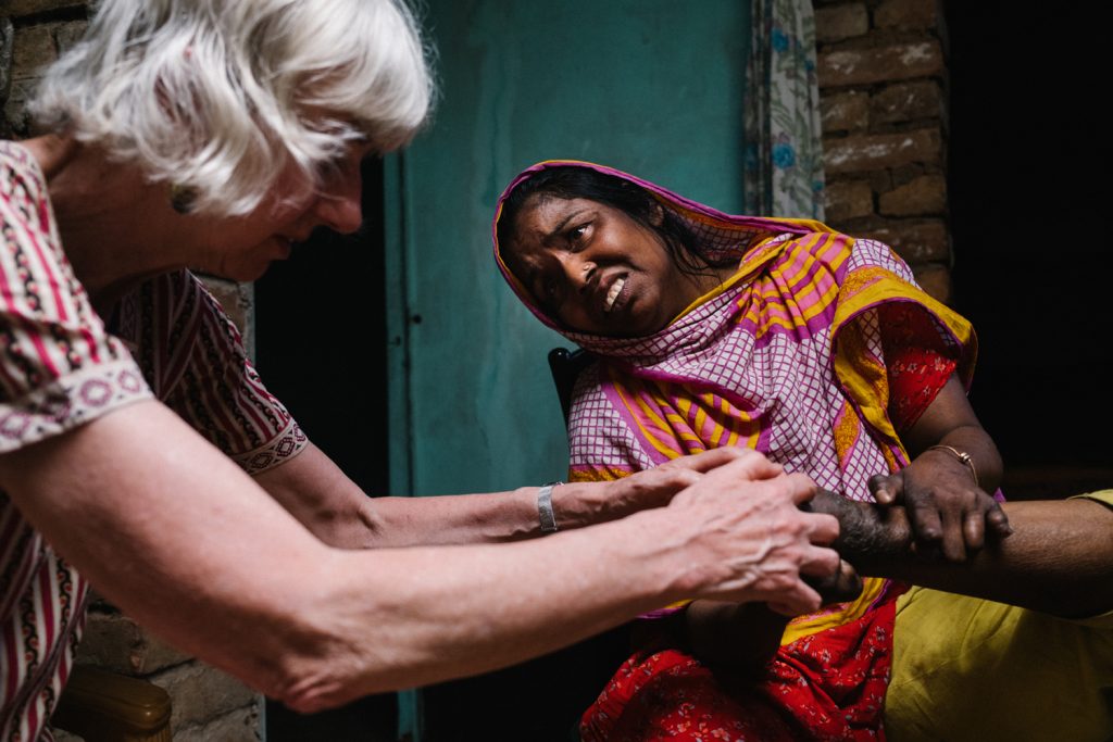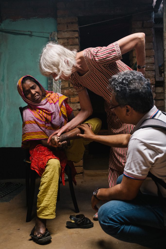 Prof Diana Lockwood and Md. Waheduzzaman Polu, the project director for Lepra in Bogura, take a look at the ulcers on Tohmina’s feet.