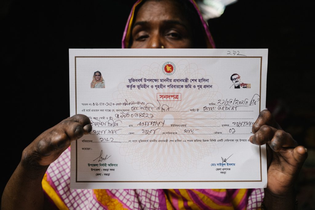 Tohmina with the certificate that shows she can move into a government built house. It’s currently being constructed.